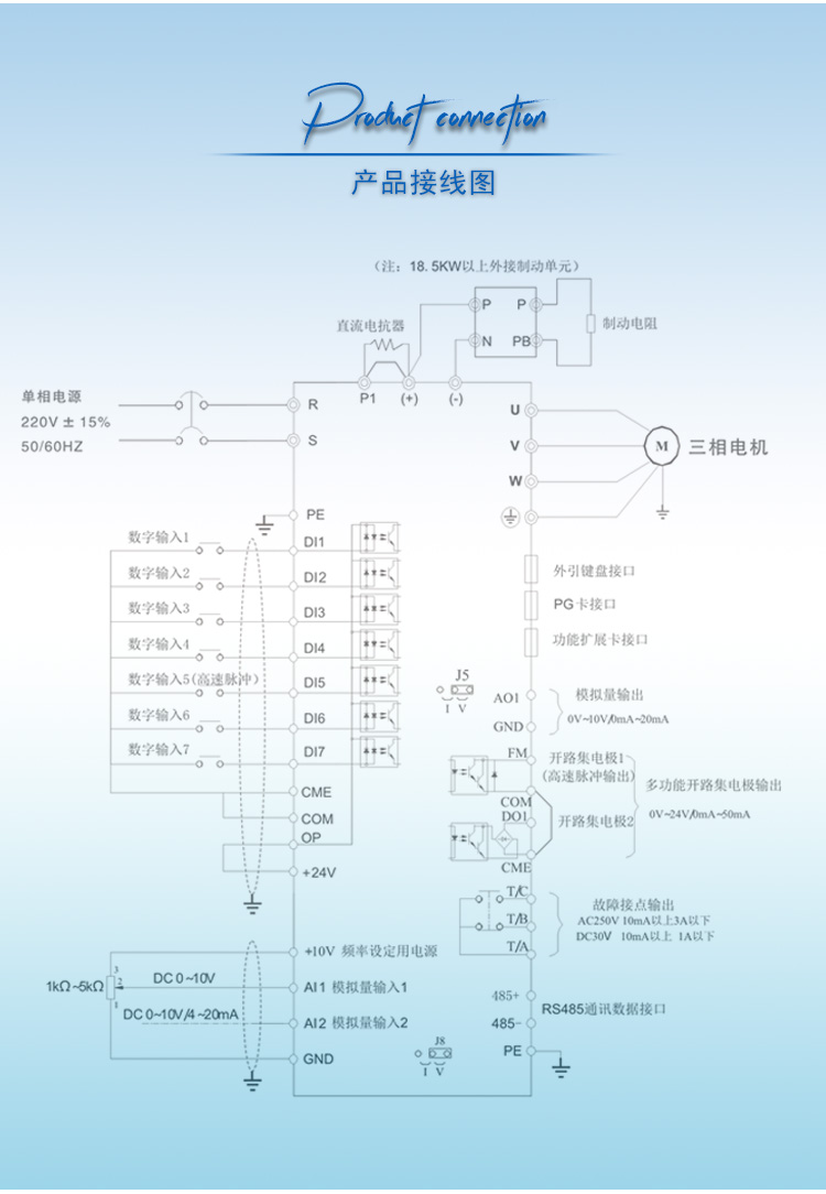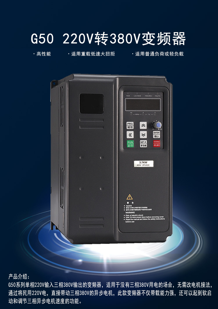 5800系列單相220V輸入三相380V輸出的變頻器,適用于沒(méi)有三相380V用電的場(chǎng)合,無(wú)需改電機(jī)接法,通過(guò)將民用220V電,直接帶動(dòng)三相380V的異步電機(jī),此款變頻器不僅帶載能力強(qiáng),還可以起到軟啟動(dòng)和調(diào)節(jié)三相異步電機(jī)速度的功能。